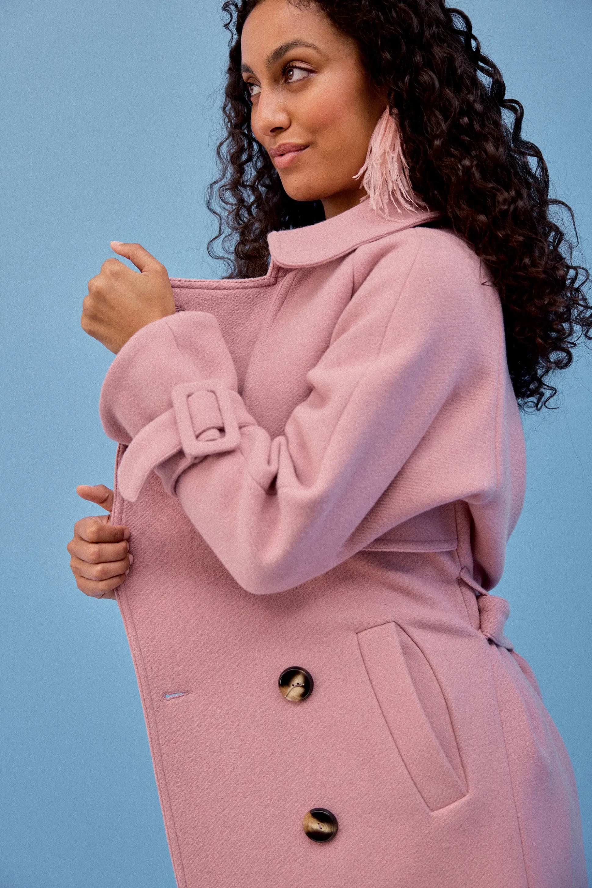 Manteau long laineux. Col à revers avec double rangée de boutonnage sur le devant. 6 boutons jaspés. Bas volets sur les devants, et poches passepoilées. Dos avec couture milieu dos et fente sur le bas. Passants sur les coutures côtés. Manches raglan longues avec deux coutures, resserrées en bas de manche par une bride passée dans une boucle recouverte de tissu. Ceinture amovible en tissu. Entièrement doublé.